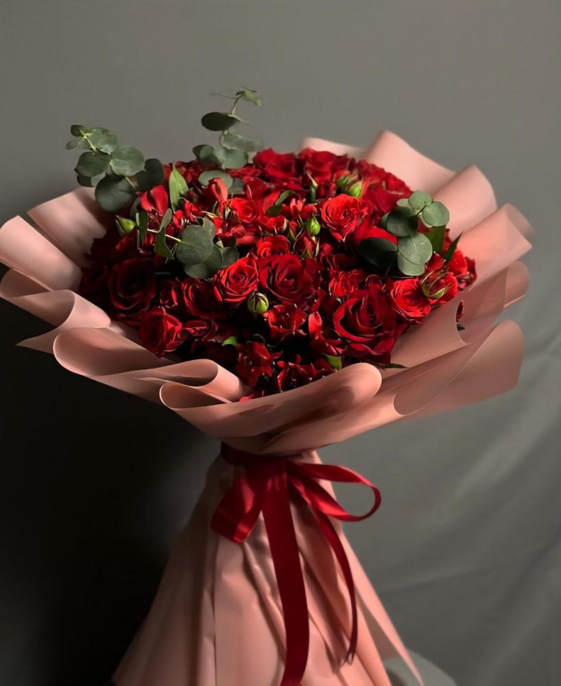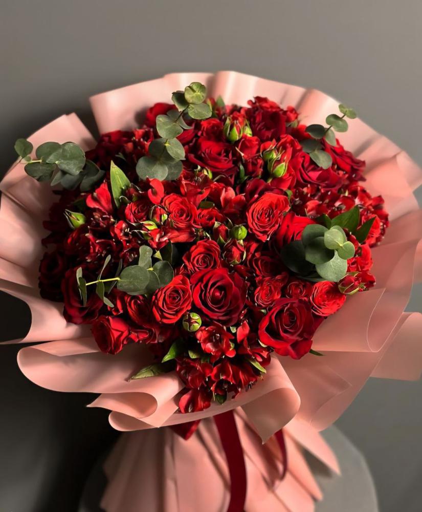 باقة ورد جوري أحمر فاخر مع أستوميريا وكليبتوس