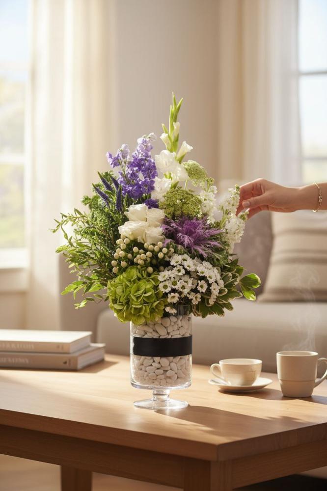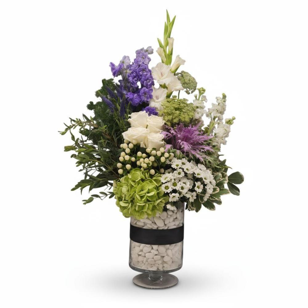 تنسيق فاخر من فازات الورد الطبيعي يجمع بين الأناقة والرقي، مكون من جلاديولس المميز، دلفينيوم الفخم، بيبي كريز، ماتيولا العطرة، روز فاخر، خله، فيرونيكا، كليبتوس، ملفوف، وهايبركم ليمنح مظهراً مبهجاً وفريداً.