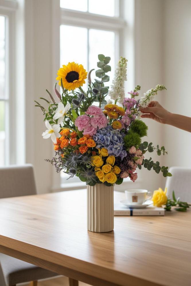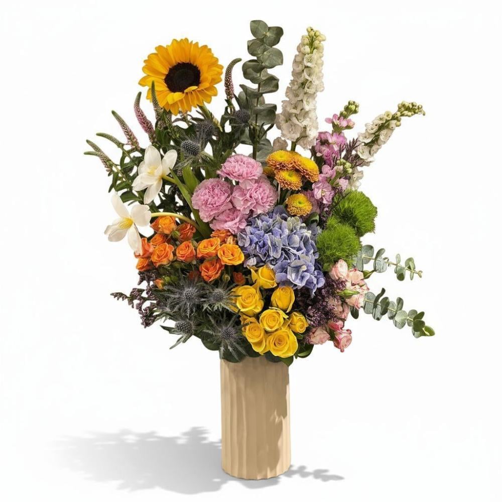 - فازة ورد طبيعي بتنسيق فاخر يضم دوار الشمس وتوليب وروز وماتيولا