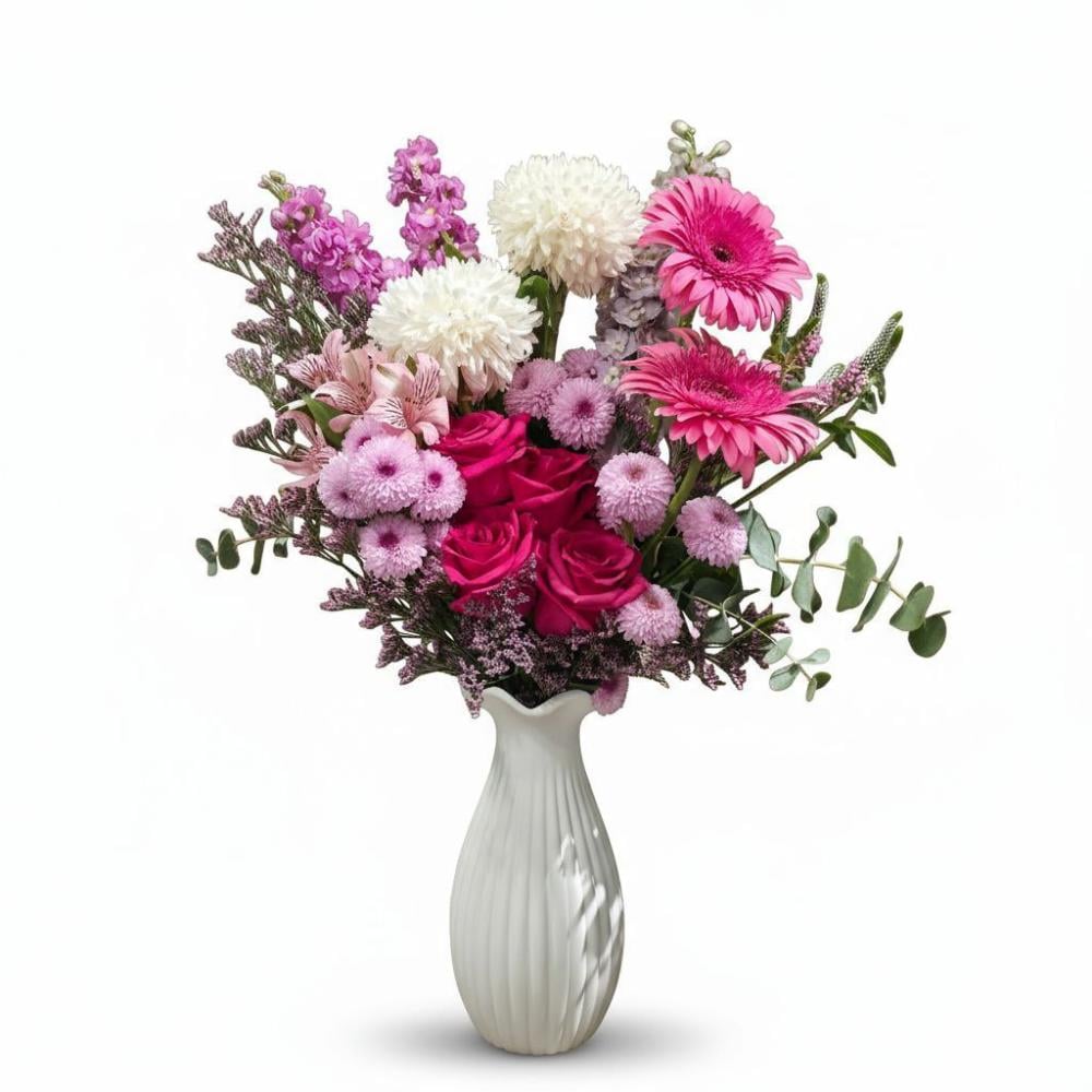 فازة ورد طبيعي فاخر تجمع بين الجربيرا والروز والدلفينيوم والماتيولا بلمسة فنية أنيقة. تناسب الهدايا والمناسبات الراقية. نقدم توصيل سريع داخل جدة ومكة والطائف من أسرع وأرخص محل ورد فاخر في المملكة